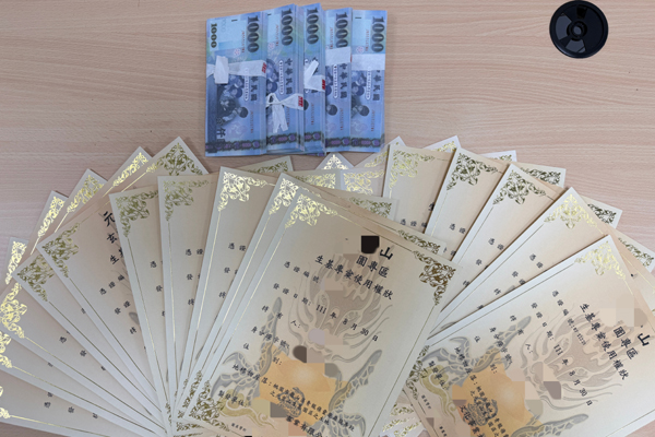 ▲中壢警方逮捕一以賣靈骨塔為名的嫌犯並搜出大批違造約和現金。(圖/中壢警方提供)