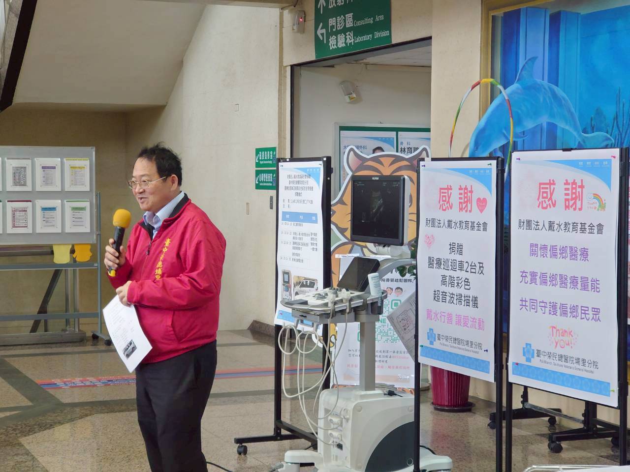 張仁義院長致詞時表示,本院服務大埔里地區鄉親,醫療服務區域覆蓋醫療資源缺乏、公共交通工具貧乏及部分道路狹小之偏遠地區,醫療巡迴車是必備之重要交通工具,除接送醫護團隊深入偏鄉提供必要且即時之醫療照護,亦擔任諸多接送任務(醫護團隊至社區進行衛教、體檢、洗腎病患、日照中心長輩等)。目前高齡長照團隊僅有1輛7人座醫療巡迴車,倘遇車況有異須維修保養或路況異常,在無備用車狀況下,可能間接影響必要之持續性醫療服務。承蒙財團法人戴水教育基金會慷慨捐贈2部醫療巡迴車加入服務團隊,除可排除交通工具不敷使用之困境,將大大提升醫護團隊訪視效率,以更快速、更便捷地抵達偏鄉,提供不間斷之醫療服務。另超音波掃描儀可協助疾病之判別診斷,廣泛運用於骨科、復健科、新陳代謝科、免疫風濕科及腸胃科等個案,有助於疾病之早期發現、早期治療;該儀器除運用於居家醫療,亦可使用於門診個案的初步檢查,將其使用效益最大化,讓更多偏鄉長者與弱勢病患,感受到即時、專業、高品質的醫療品質服務。