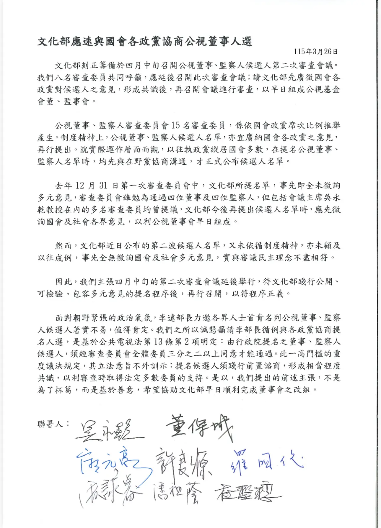 這封公開信以「文化部應速與國會各政黨協商公視董事人選」為名,署名審查委員包括吳永乾、董保城、杜聖聰、廖元豪、許良源、羅國俊、馬詠睿、潘祖蔭