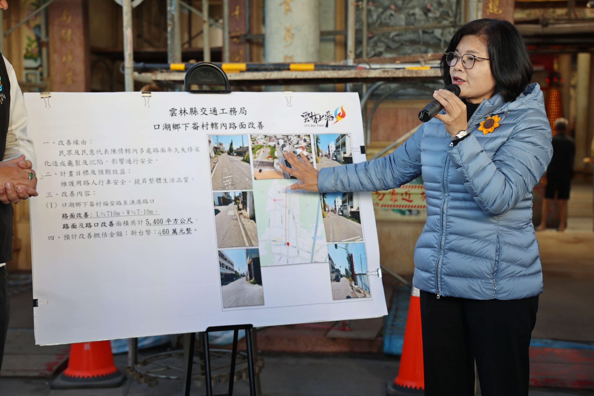 張縣長指出,完善地方道路路面,以確保人民行車安全是政府的責任,本次「口湖鄉下崙村福安路至中山路口路面改善工程(福安宮前)」不僅要讓路平,包含標線、標誌劃設符合地方需求,增加提醒警示路口閃黃燈,完成鄉親期待,也守護鄉親生命安全。