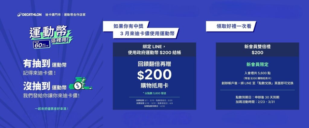 在市場表現亮眼之際,迪卡儂隨著政府運動幣上路,同步再加碼推出總計 60 萬份的「運動津貼」回饋方案:凡於門市使用政府運動幣 $200 結帳,即可獲贈等值的 $200 運動裝備津貼;新會員註冊還可同享 $200 入會禮遇 ,迪卡儂希望透過這波加碼,推動全民健康生活升級,讓更多人可以輕鬆落實運動日常!