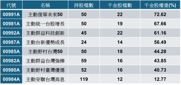 根據 2025 年底的最新數據,國內 8 檔台股主動式 ETF 均展現了強大的「認養」實力,全數納入了這 27 檔千金股。其中,00991A(主動復華未來50) 表現最為亮眼,其投資組合中包含了 22 檔千金股,合計權重高達 72.62%,不僅在同類產品中居冠,更超越了素有國民 ETF 之稱的 0050(其千金股權重為 70.4%),00981A67.7%居次,此外,00992A、00987A的比重也都有超過5成。