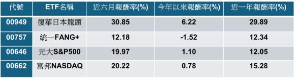 富邦NASDAQ(00662)近六個月報酬率達20.22%,近一年為15.28%,表現亦不俗。元大S&P500(00646)及統一FANG+(00757)近六個月報酬率則分別為19.97%、12.18%,近一年報酬率則皆落在12%左右。