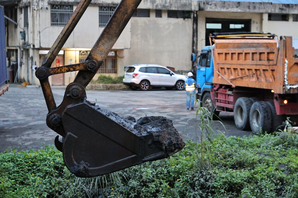 工務處長簡翊哲報告,截至晚間,今日已完成約13車次、共65立方公尺土方清運,整體清淤進度約五成,市府團隊將持續於夜間作業;另為加速清除水面油污,已於晚間調派吸泥車進行油水抽離,協助恢復河道水質。