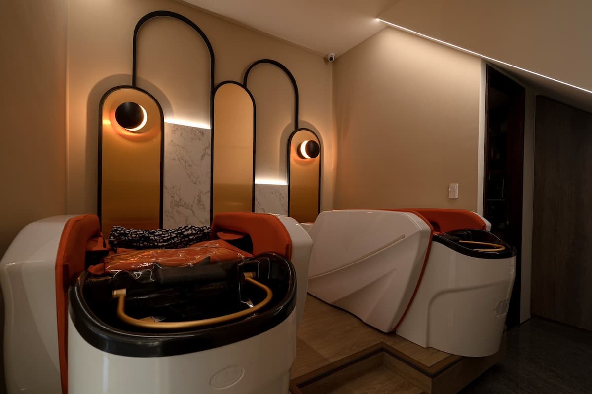 沙龍設有獨立洗護與頭皮養護空間,結合燈光與環境設計,提升顧客整體放鬆體驗。圖/双月美學髮藝提供