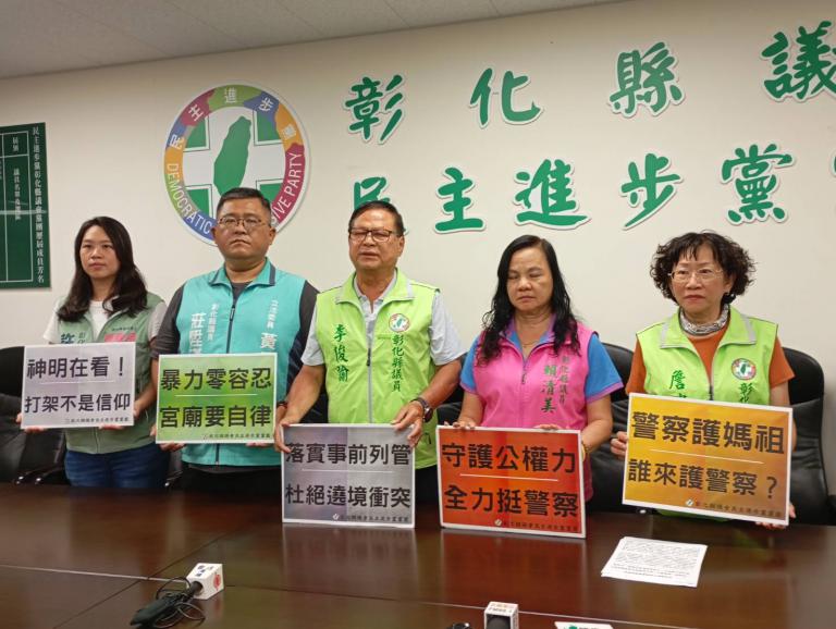 ▲大甲媽祖遶境行經彰化期間,接連爆發兩起嚴重衝突事件,導致3名警察受傷,彰化縣議會民進黨黨團21日召開記者會,嚴正譴責暴力行為無視法治,並表達對第一線執勤員警的全力支持。(圖╱記者孔亮云攝)