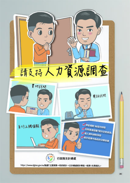 因此,行政院主計總處每月會隨機抽選約2.1萬個家戶,並派員辦理「人力資源調查」,如果當月貴戶正好被抽選為樣本家戶,所在縣市訪查員會先行寄送「致受訪戶函」通知,然後依約定時間前往「實地」或「電話」訪問;或者,您可參照「致受訪戶函」說明,自行上網填報(網址:https://mp-survey.dgbas.gov.tw/),這樣一來,訪查員就不會再去打擾您。