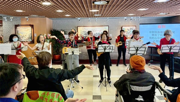 長庚養生村烏克麗麗班,為「百歲畫愛 院望啟程」開幕茶會開場演出。