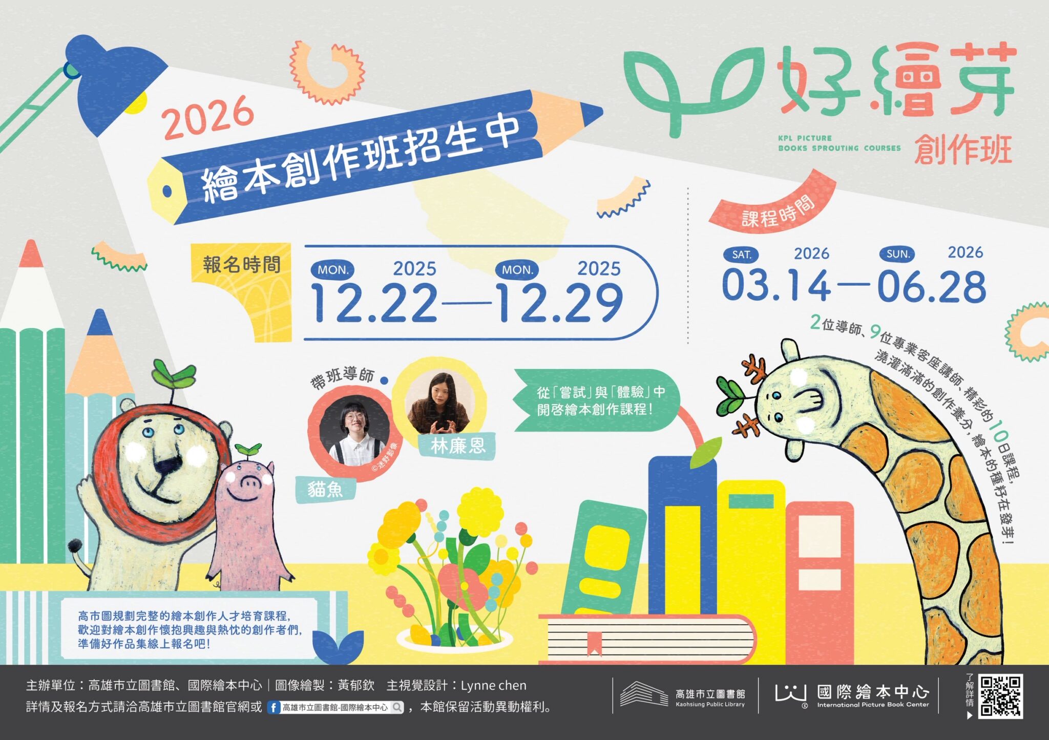 高雄市立圖書館辦理「《好繪芽》繪本創作人才扶植計畫」,自2019年起持續推動臺灣圖文創作的蓬勃能量。其中每年辦理的創作班,至今已陪伴近180位創作者完成作品雛形、踏上創作道路,更有學員成功出版,累積亮眼成果。明年度的「2026《好繪芽》繪本創作班」將於12月22日至12月29日開放線上報名,誠摯邀請熱愛故事、擁抱創意、渴望拓展創作生涯的朋友一同加入。 圖説:擅於說故事與寫故事的客座講師海狗房東,與學員分享故事的文本書寫與創作技巧。。(高市圖提供) 高雄市立圖書館李金鴦館長表示,《好繪芽》繪本創作班即將邁入第七屆,不僅成為南臺灣最具代表性的繪本創作教育品牌,也深受全臺創作者肯定。高市圖以國際繪本中心的16萬冊豐富館藏推廣圖像閱讀,逐年透過系統化課程、創作指導與徵獎平台,打造臺灣原創繪本的孵化場域,讓創作者能在此獲得實力養成、能量交流與出版市場接軌的可能;讓讀者能看見更多動人、富想像力的原創好故事。 2026《好繪芽》繪本創作班將於明年3月至6月舉行,全程共計10日。本屆特別邀請擅於以複合媒材創作、風格各具特色且屢獲國內外獎項的繪本作家──貓魚與林廉恩,共同擔任帶班導師並規劃課程,以「嘗試×體驗」為核心,引導學員運用多元的創作形式、媒材與風格進行探索,帶領學員摸索並建立個人創作特色與風格。 圖説:2025創作班導師張淑瓊(左)與崔永嬿(右)出席參與成果展覽分享會,與高市圖館長李金鴦(中)一同合影。(高市圖提供) 課間亦邀請多位繪本產業與領域相關實務經驗豐富的客座講師,從認識繪本、故事創作與文本書寫、媒材技法運用、圖文敘事、編輯實務到著作權法等相關多元的知能與知識,陪伴學員以系統化架構與實作練習,掌握繪本創作所需的專業知能。邀請強大的師資陣容,包含Dino大恐龍、BALLBOSS、薛慧瑩、顏志豪、詹迪薾、李瑾倫、林珈如、馬尼尼為,以及著作權法專家姚信安教授,陪伴每一個創意從萌芽成長為完整的故事作品! 「這是讓我相信自己能創作的一段旅程」、「在這裡遇見一群同樣熱愛創作的人,原本孤獨的路突然變得亮起來。」過去六年來,《好繪芽》陪伴許多創作者在不確定與懷疑中找到自己的語言。學員不僅從多元觀點獲得養分,也能在閱讀與交流中看見繪本創作裡的多元性與可能性。同時,在不斷與雙導師的討論與回饋中,反覆思考與審視自己的創作,讓作品更加完整與鮮明。 圖説:2025《好繪芽》繪本創作班導師與學員大合照。(高市圖提供) 《好繪芽》繪本創作班口碑持續提升,本屆將延續過往能量,結合國際繪本中心館藏資源與豪華講師群,邀請全臺各地創作者報名參與。歡迎於12月29日前提供作品集報名,將由導師審核錄取30名學員於隔年3至6月的周末參與課程。歡迎對圖像語言或故事文本懷抱熱情的創作者,一同把握一年一度的精實繪本創作課程!課程詳情請至高市圖官網了解相關資訊(https://ppt.cc/fadPbx)。
