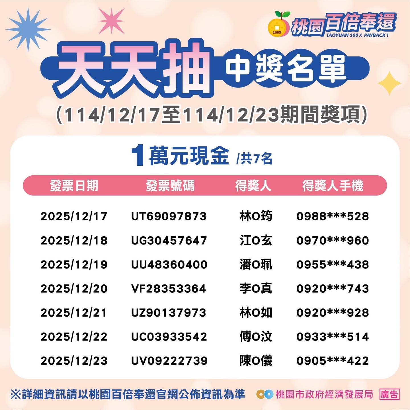 【Lai傳媒、記者爆料網/謝建成/桃園報導】桃園市府推出的「普發一萬・桃園百倍奉還」抽獎活動,本來是年底振興消費的亮點,卻因「同一名得主連續抽中 1 萬與 5 萬」掀起網路熱議。網友比對得獎名單後發現,12 月 19 日與 21 日的兩個獎項,得主姓名隱碼與手機後三碼完全相同,質疑聲瞬間炸開。 ▲ ▼桃園”百倍奉還”抽獎爆爭議!同一人連中兩獎遭質疑 市府回應:全程律師見證.(圖/翻攝 桃園市經發局臉書) 不少網友直呼「這機率也太玄」、「看起來很黑箱」;也有人認為「就是有人運氣好」。桃園市議員黃瓊慧也提醒,抽獎若缺乏公開透明,很容易造成誤會。 對此,經發局火速澄清,活動從 11 月 12 日開始至今的五波抽獎,全程由律師見證,並以電腦隨機抽選,沒有人工介入,也不存在黑箱。至於為何會出現重複中獎?市府解釋,活動採「累積序號制」,民眾每筆滿 100 元就能獲得序號,未中獎的序號會累積至下一次抽獎,因此同一人多次中獎並非不可能。 據了解,目前活動登錄金額已突破 15 億元,市府也從 12 月 20 日起啟動「商圈週年慶」,再加碼抽 2000 元。整體活動將持續到 12 月 31 日,明年 1 月 7 日前完成登錄都還有機會抽中百萬大獎。 標籤: 合作媒體賴傳媒 本文為「記者爆料網」授權刊登,原文網址