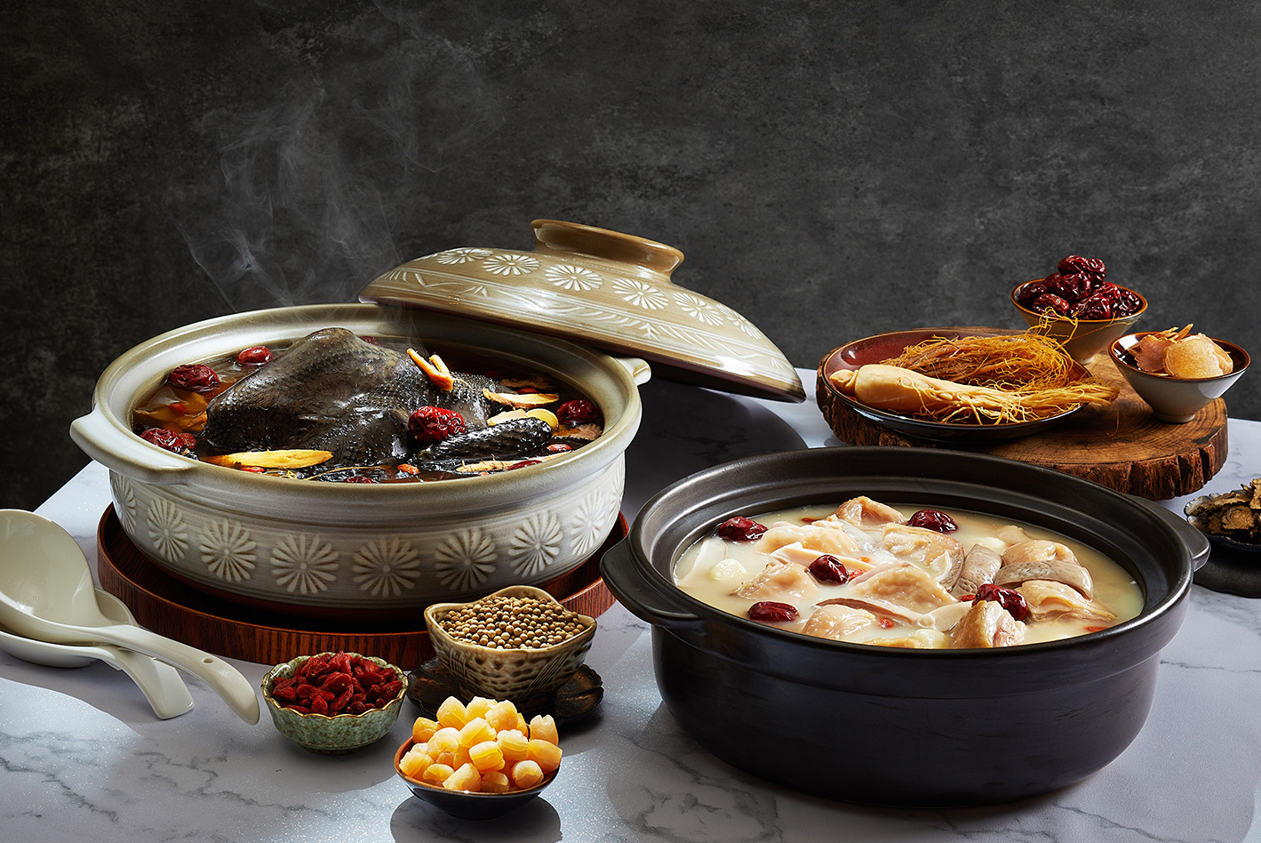 今年最大亮點,是福容首度與韓國百年品牌「正官庄」攜手推出聯名料理包──福容御品蔘雞湯。嚴選 6 年根高麗蔘入湯,金色湯頭帶著人蔘馥郁香氣,被視為最具體面的年節伴手禮,只要 480 元即可入手,會員另享分級折扣。正官庄台灣法人長徐正烈指出,看準台灣家庭對「團圓料理」的重視,此次跨足料理包市場,希望將健康便利的湯品帶進更多家庭。若聚餐人數更多,也可選擇「雙蔘烏骨雞湯」與「胡椒豬肚雞湯」,滋補溫潤、份量十足,是冬季最受歡迎的暖心料理。