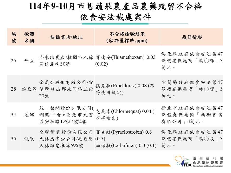 【Lai傳媒、記者爆料網/謝建成/台北報導】年末聚餐旺季來臨,大家外食頻率飆高,但吃進嘴裡的蔬果是否安全?衛福部食藥署今(31)日公布「114年度市售蔬果農藥殘留監測」9~10月結果,檢驗超過800件市售蔬果,竟有45件農藥殘留不合格,多家知名餐廳、飲料店、量販賣場全都中鏢,引發民眾關注。 築間、涮乃葉、50嵐都中鏢 食藥署抽驗蔬果「45件農藥違規」.(圖/食藥署 提供) 築間、涮乃葉、50嵐都中鏢 食藥署抽驗蔬果「45件農藥違規」.(圖/食藥署 提供) 這次遭點名的名店不少,包括築間火鍋板橋館前店、涮乃葉徐匯廣場店的油菜驗出農藥超標,連鎖飲料店 50 嵐南投民族店的金桔也被發現含有 2 項不符規定的農藥。其他違規項目還包含:全聯草屯和興店的蘿蔔、好市多台中店的茄子,甚至連富邦旗下 MOMO 的蓮霧也被查出不合格。北市內湖七海餐廳的香菜更誇張,一口氣被檢出 10 項農藥不合格,業者全數依法開罰。 食藥署說明,這次採「風險為基礎」的精準抽驗策略,在284件重點監測樣品中,合格率為89.1%;隨機抽驗519件中,合格率則達97.3%。透過科學化分析與大數據定位,確實提高揪出違規品項的效率。 築間、涮乃葉、50嵐都中鏢 食藥署抽驗蔬果「45件農藥違規」.(圖/食藥署 提供) 築間、涮乃葉、50嵐都中鏢 食藥署抽驗蔬果「45件農藥違規」.(圖/食藥署 提供) 目前所有不合格產品均已要求下架回收,並針對無法交代來源或涉及違規的供應商開罰 30 萬元。可追溯來源的國產農產品也已移請農政單位持續追查。 築間、涮乃葉、50嵐都中鏢 食藥署抽驗蔬果「45件農藥違規」.(圖/食藥署 提供) 食藥署提醒,民眾挑選蔬果時可優先選當季、具產銷履歷、有機或 CAS 認證的產品。買回家後,蔬菜務必「浸泡+沖洗」再切;水果「洗淨再削皮」,才能有效減少農藥殘留。 本文為「記者爆料網」授權刊登,原文網址