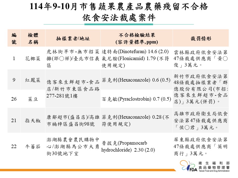 目前所有不合格產品均已要求下架回收,並針對無法交代來源或涉及違規的供應商開罰 30 萬元。可追溯來源的國產農產品也已移請農政單位持續追查。