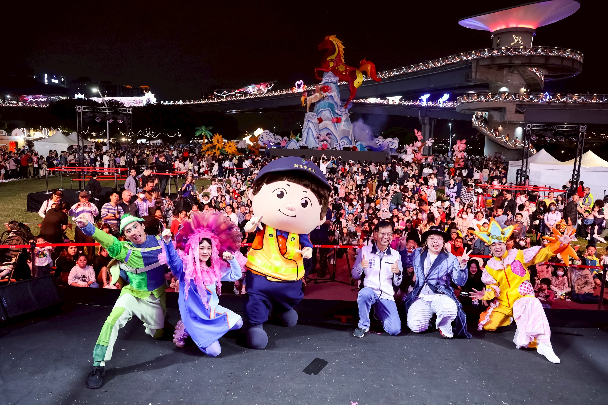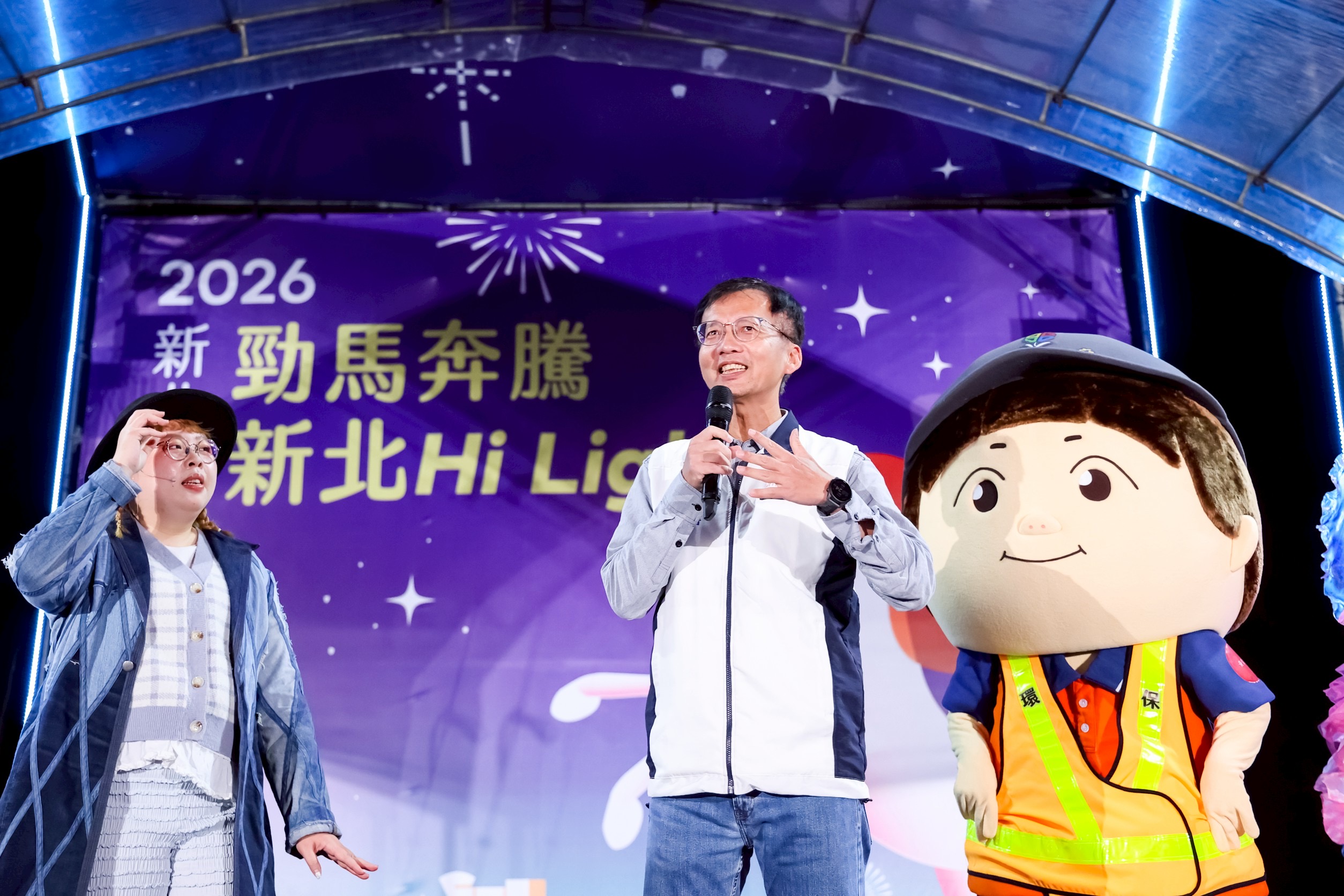 在璀璨燈火的映襯下,莫過於3月1日晚間的驚喜瞬間。環保大使「寶吉」與新北環保局主任秘書許銘志一同走入群眾,許主秘拋開官方形象,以活力十足的姿態與大小朋友玩起環保快問快答,引導孩子思考如何在日常落實「不塑新生活」。這種結合吉祥物魅力與參與式對話的設計,徹底打破政令宣導的單向框架,成功捕捉現場小朋友的心,將節慶氣氛推向最高潮。