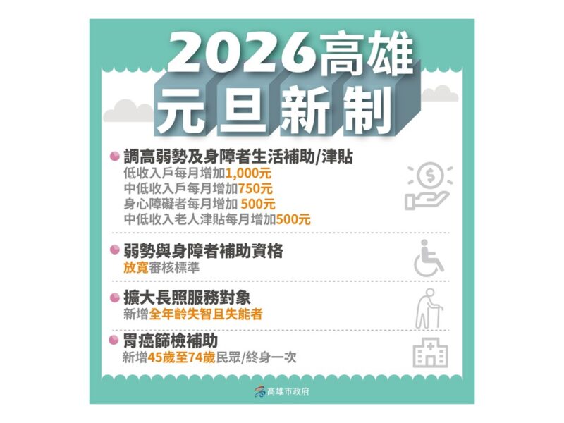 【News586/記者張淑慧報導】高雄市政府公布2026年元旦多項新措施,持續優化社福弱勢照顧範圍及補助、提升勞工權益、強化市民交通安全保障、1999新增「真人文字客服」,全方面照顧市民生活需求。
