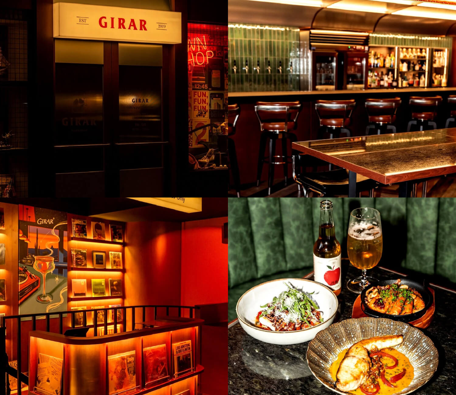 原本是禁酒令時期的文藝復興風,GIRAR bar全面改裝後,進化為摩登復古與包浩斯美學的新風貌,完成了一場風格華麗的蛻變。店內整體空間更加時髦現代,保留了 GIRAR 經典的靈魂元素Speakeasy的隱密氛圍、牆上的壁畫,以及經典菜色毒梟炸雞與古巴三明治。每週六安排駐場 DJ,同時帶來全新菜單,更多創意料理與調酒選項,嶄新樣貌的GIRAR,感覺更加有趣了。