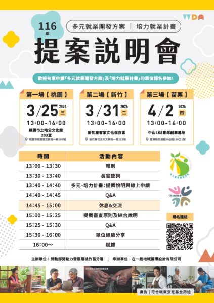 ▲桃竹苗分署分別於3月25日在桃園、3月31日在新竹及4月2日在苗栗辦理三場次的「多元及培力就業計畫」提案說明會,鼓勵民間團體提出具創意性、地方性及發展性的計畫,共同創造在地就業機會。(資料照/桃竹苗分署提供) 【焦點時報/記者羅蔚舟報導】勞動部勞動力發展署桃竹苗分署推動「多元就業開發方案」及「培力就業計畫」,協助在地民間團體發展、活絡地方產業並帶動在地就業機會,同時鼓勵民間團體提出具創意性、地方性及發展性的計畫,媒合失業者參與計畫工作,共同創造在地就業機會。桃竹苗分署分別於3月25日在桃園、3月31日在新竹及4月2日在苗栗辦理提案說明會,並於今年首度採線上直播方式同步辦理,歡迎有意提案的民間團體踴躍報名參加。 ▲桃竹苗分署分別於3月25日在桃園、3月31日在新竹及4月2日在苗栗辦理三場次的「多元及培力就業計畫」提案說明會,鼓勵民間團體提出具創意性、地方性及發展性的計畫,共同創造在地就業機會。(圖/桃竹苗分署提供) 桃竹苗分署規劃3場次「多元及培力就業計畫」提案說明會,協助有意提案之民間團體瞭解方案內容、申請方式、執行規範及審查原則等資訊,今年首場提案說明會於3月25日在「桃園市土地公文化館」辦理,並安排「有限責任桃園市野農生產合作社」分享社區推行無毒零汙染農產品生產模式;第二場於3月31日在新竹縣「新瓦屋客家文化保存區」辦理,邀請到「有限責任新竹縣那山月桃農業運銷合作社」介紹以月桃發展部落產業與體驗遊程的成果;第三場於4月2日在苗栗縣「中山168青年創業基地」辦理,並由「苗栗縣在地文化推廣協會」分享如何運用多元計畫發展地方文化事業的實務案例。透過各單位第一線的分享與交流,讓有意提案的民間團體能更具體了解計畫執行模式與發展方向,掌握成功經驗,提升提案與計畫推動的可行性。 桃竹苗分署為克服地理距離及時間限制,減輕民間團體往返負擔,今年特別採「實體與線上雙軌併行」方式辦理,透過同步直播提供即時資訊,使未能到場之團體亦能掌握重要內容,提升政策宣導效益並兼顧資訊取得之公平性。即日起受理報名,歡迎有意申請計畫的民間團體則擇一場次報名參加,報名網址: https://forms.gle/CfoLzPFbDZQNw6fC6 。 桃竹苗分署長賴家仁表示,桃竹苗分署近3年推動多元及培力計畫,已補助289家民間團體,協助1,070名失業者重返職場,並透過諮詢輔導、進用對象教育訓練及聯合行銷活動等多元措施,長期陪伴在地團體穩健發展與成長,攜手促進地方產業發展。今年提案說明會除說明多元及培力計畫相關規定及審查原則外,也特別邀請優良執行單位分享實務經驗,透過經驗交流與觀摩學習,促進民間團體彼此借鏡,同時加深對桃竹苗在地文化與產業特色的認識。如有報名相關問題,可洽詢03-4855368分機1214高小姐,或至桃竹苗分署官網 ( https://thmr.wda.gov.tw/Default.aspx ) 查詢更多資訊。