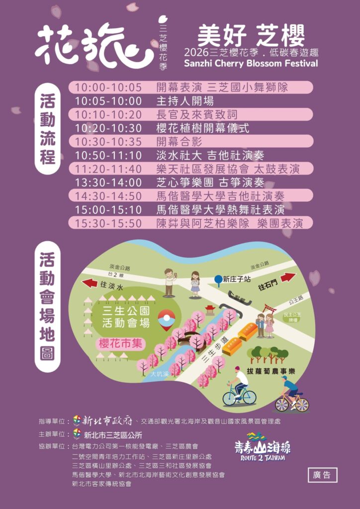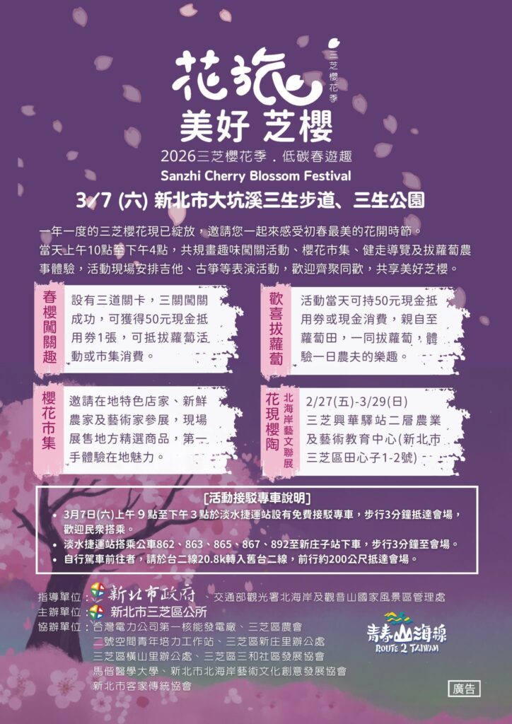 三芝區公所誠摯邀請民眾把握花期,攜家帶眷前來三芝,一同漫步櫻花步道,賞花、聽音樂、逛市集、玩闖關,感受春天限定的幸福時光。