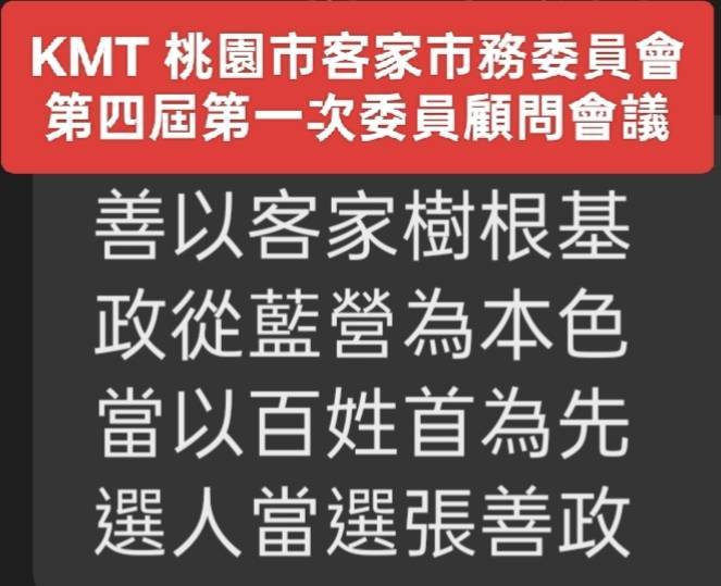 隨後,桃園市大家長張善政特別蒞臨 KMT桃園市客家市務委員會的第四屆第一次委員顧問會議,為新一屆的啟動鼓勵打氣。張善政在會中強調客家文化的重要性,並表達對委員會未來工作的期待與支援。