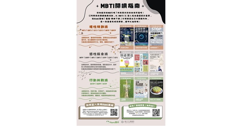 波新聞─陶泰山/台北每個人格,都有屬於自己的閱讀氣質。Hami書城×臺北市立圖書館於12月推出「MBTI×閱讀-性格選書趣」主題書展活動,依人格特質打造專屬書單。走進「書籍-限時下載」分類,挑一本與你靈魂契合的書,填寫表單還有機會抽中好禮!自即日起至12月31日止,透過Hami書城×臺北市立圖書館-數位書報雜誌閱讀服務(連結),完成閱讀任務並回復表單(連結),就有機會抽中Hami書城月讀包體驗序號及hahababy系列商品,一起來參加吧!活動詳情歡迎電洽服務專線(02)2755-2823轉2301。