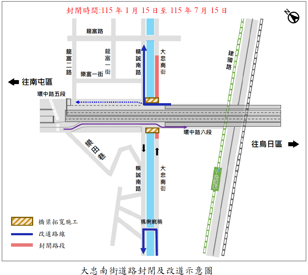台中市政府地政局表示,因應環中路五段及六段拓寬工程施工需求,施工期間將分階段實施道路封閉與交通調整措施。原行經大忠南街(龍富路至環中路)之車輛,請改由精誠南路通行;原行經大忠南街(環中路至楓樹麻橋)之車輛,請改由楓樹麻橋銜接精誠南路通行,以降低施工期間對交通動線的影響。
