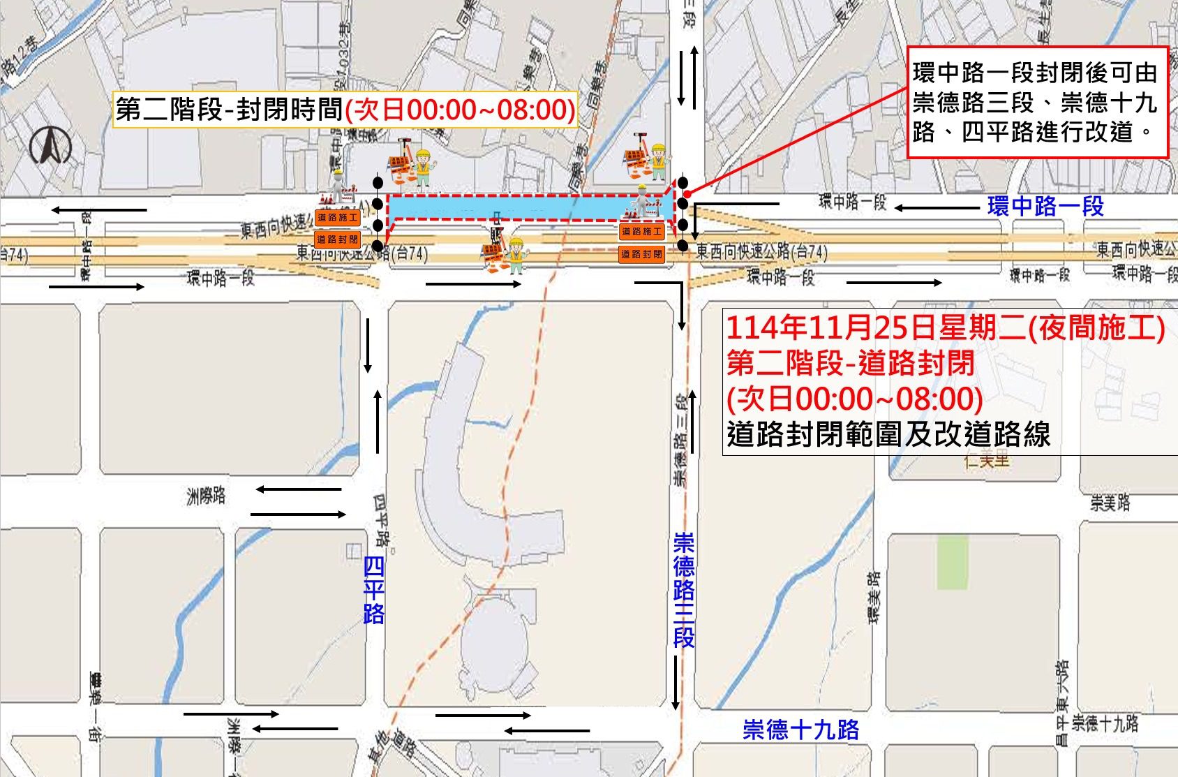 建設局於25 日晚間 8 時起至26 日上午 8 時,針對環中路一段北側(崇德路三段至四平路)施作夜間燙平工程