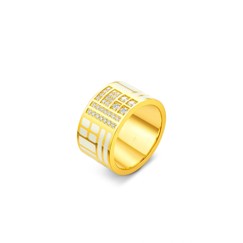傳福系列的設計靈感源自周大福標誌性的「福」字,象徵周大福對幸福生活的美好頌讚,以及將福氣代代傳承的美好祝願,是周大福的代表性系列。戒指設計巧妙運用正「福」與倒「福」的交錯排列,呼應傳統文化中「福到」的吉祥寓意,戒指上一圈連綿的“福”也寓意著佩戴者的福氣連綿不絕,為佩戴者寄予美好祝願。款式簡約而不失細節,輕鬆駕馭各種穿搭風格,成為日常中不經意的精緻亮點。