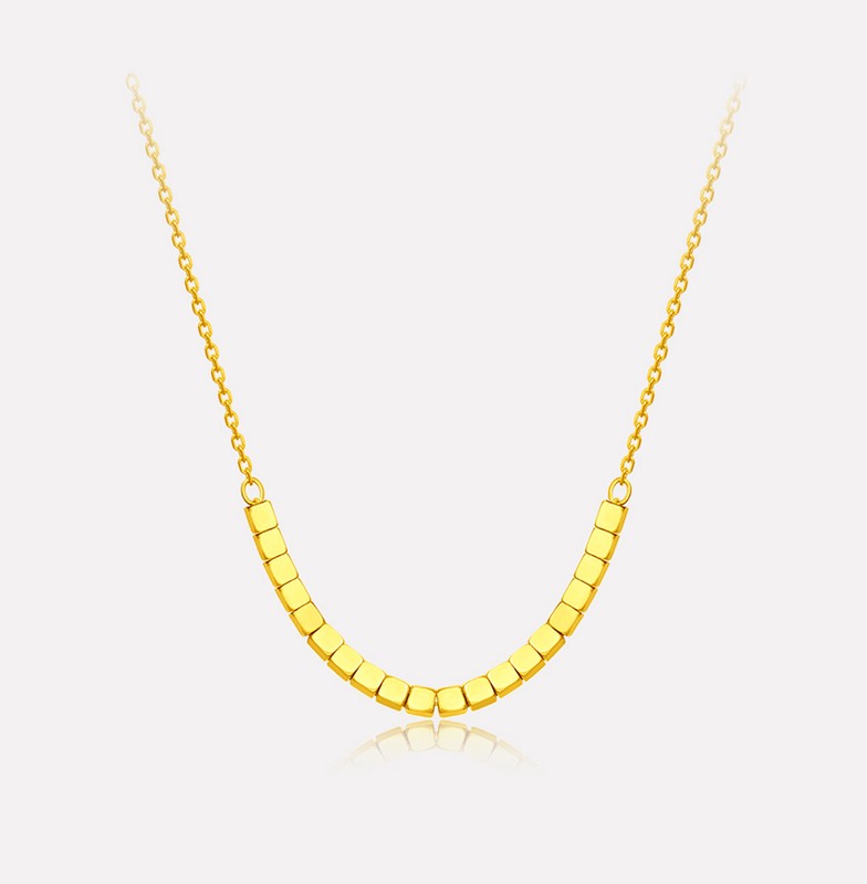 每一顆小金珠皆以立體方形排列設計,圓潤線條勾勒出經典的微笑弧度,搭配細緻打磨拋光工藝,更顯時尚亮眼。佩戴於鎖骨之間,綻放迷人光彩。每個切面都閃閃發亮,就像不管是做自己還是任何角色都閃閃發光的現代女性;不論是搭配職場穿搭的俐落西裝,或是融入日常休閒裝扮,皆能為整體造型畫龍點睛,成為令人心動的耀眼焦點。簡約大方的幾何設計也使疊戴更加合適,輕鬆搭配其他首飾,展現個人風格。
