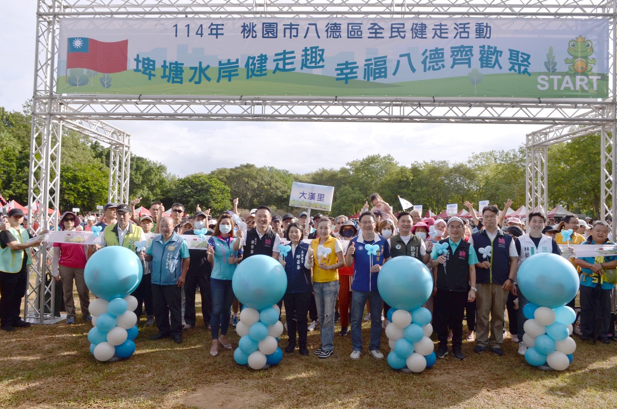由桃園市八德區公所主辦的「埤塘水岸健走趣 幸福八德齊歡聚」114年桃園市八德區全民健走活動,於今(19)日在八德埤塘自然生態公園熱鬧登場,吸引近萬名市民熱情參與,沿著生態水岸完成約4公里的健走路線,為八德注入滿滿的運動活力與社區凝聚力。