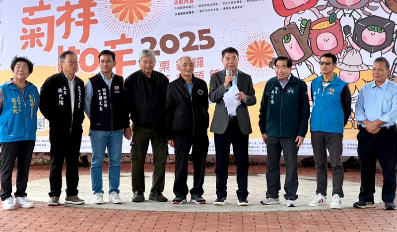 2025苗栗銅鑼杭菊芋頭節-菊祥如芋將在11月22、23日一連兩天,於秋美人農場登場。銅鑼鄉農會為推廣在地農產品及當地農村之美,今(13)日舉辦宣傳記者會,苗栗縣長鍾東錦及農糧署北區分署長林傳琦、農村水保署台中分署長陳俊榮、議員黃芳椿、銅鑼鄉公所祕書賴文良、代表會主席林九炲、農會三巨頭以及地方民意代表等人共同為活動揭開序幕。