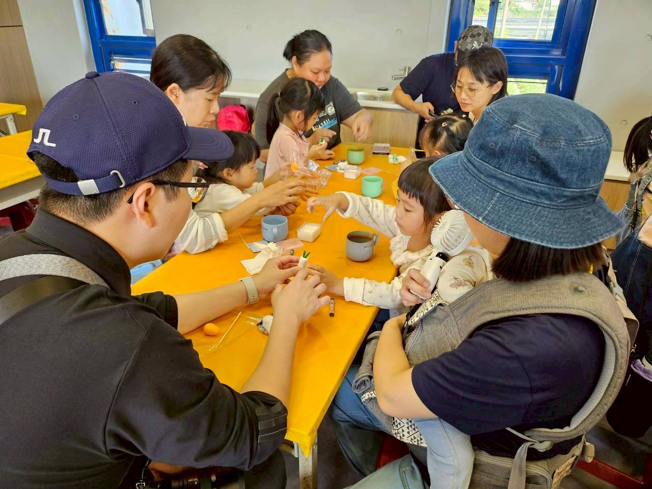 餐後前往美濃客家文物館,進行輕黏土磁鐵DIY。志工老師講故事〈麼人好食白玉蘿蔔〉後,家長與孩子們分組創作,是白玉蘿蔔與澄蜜香小番茄造型,小手拼貼,每個孩子都完成獨一無二的作品。